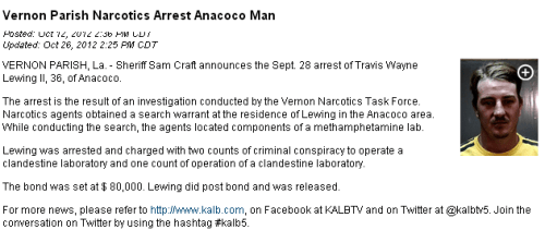 VERNON PARISH, La. – Sheriff Sam Craft announces the Sept. 28 arrest of Travis Wayne Lewing II, 36, of Anacoco.
