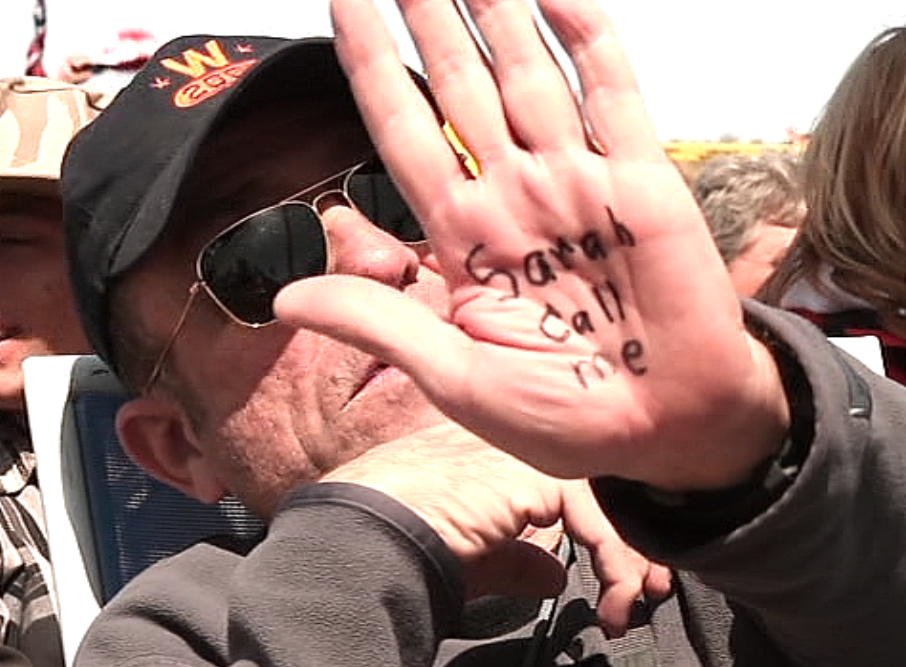 Although I was alone, when this guy (pictured below) flashed his hand at the camera during a Tea Party rally – I literally laughed out loud. However, I did not roll on the floor.