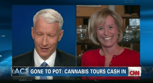 In a must-see-to-believe segment in CNN’s “Gone to Pot” series covering the historic legalization of recreational marijuana in Colorado, CNN reporter Randi Kaye interviewed pot entrepreneur “Grandma Barbara” (72) and took a limousine tour of marijuana dispensaries with a few weed enthusiasts. Unsurprisingly, the fellow passengers on the “Cannabis Tours” trip, enjoyed some now perfectly legal, “small canon”-size joints. The result was an increasingly giggly CNN reporter who admitted later to Anderson Cooper that she “got a little bit of a contact high.