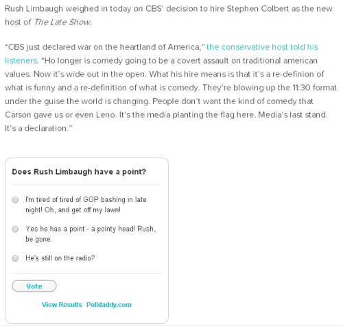 Oh, big boogeyman Rush said something again. Colbert will say something, Sean Hannity will say something, Glenn Beck will say something, Jon Stewart will say something. Some blogger will say something.