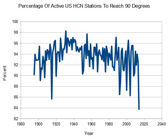 The percentage of US HCN stations to reach 90 degrees was the smallest on record this year, with four of the five coolest years occurring above 350 PPM CO2. The most widespread heat occurred in 1931, when more than 98% of stations were over 90 degrees.