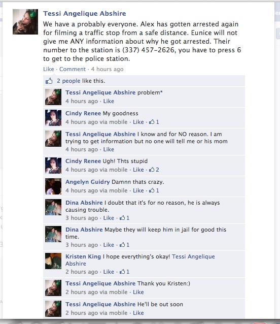 This time it was the Eunice Police Department that arrested Lege, according to his girlfriend, Tessi Angelique Abshire, who posted the news on a Facebook page Lege created called Eunice Uncensored, where he attempts to shed a light on the police department.