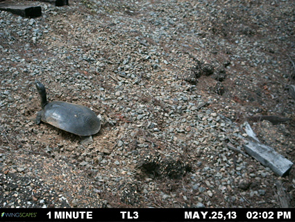 Her research under Carr’s supervision is a spin-off project of his work with alligator snapping turtles at Black Bayou Lake, sponsored by the Friends of Black Bayou. “I’ve known about an area used heavily for nesting by soft-shelled turtles for many years, but I never had anyone dedicated to looking at the soft-shells. Now we are getting an idea of what is going on with the nesting there — when they nest, how long it takes, and how the turtle nests are destroyed by predators at an alarming rate.”
